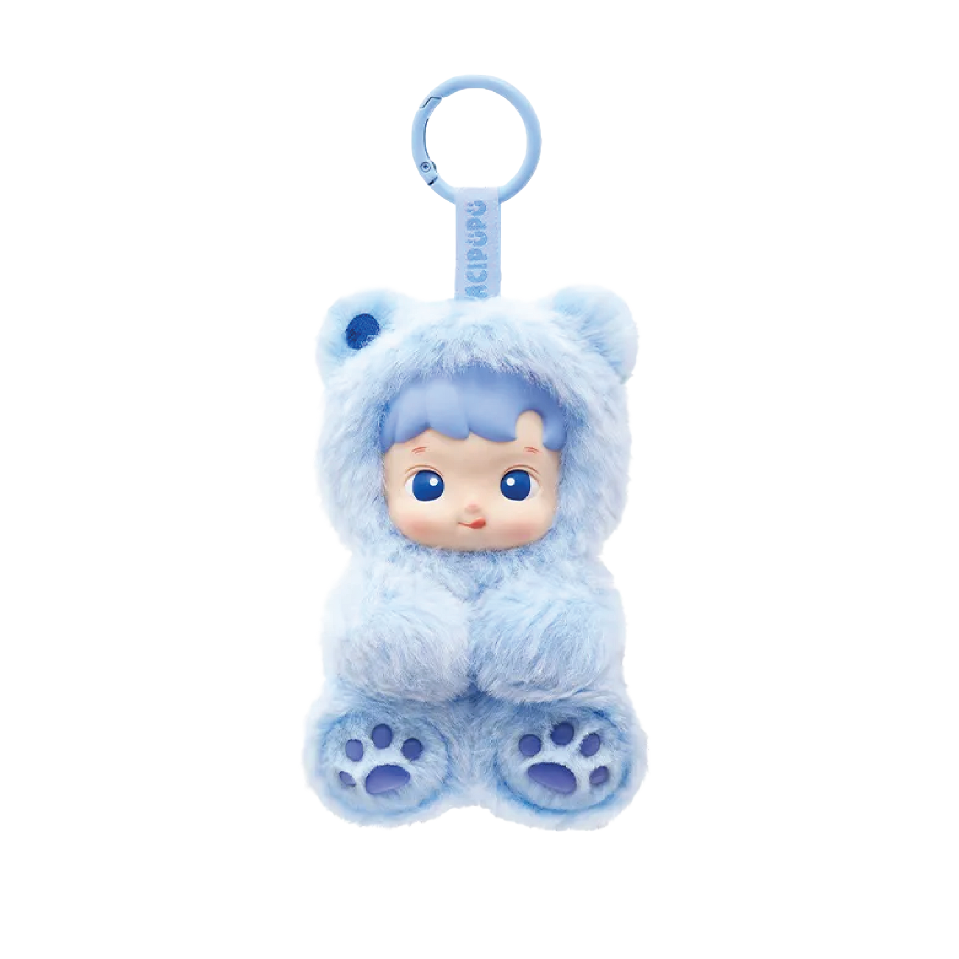 The series features vinyl plush pendant blind boxes—adorable, fuzzy Hacipupu figures styled like gummy bears with small loops for hanging.